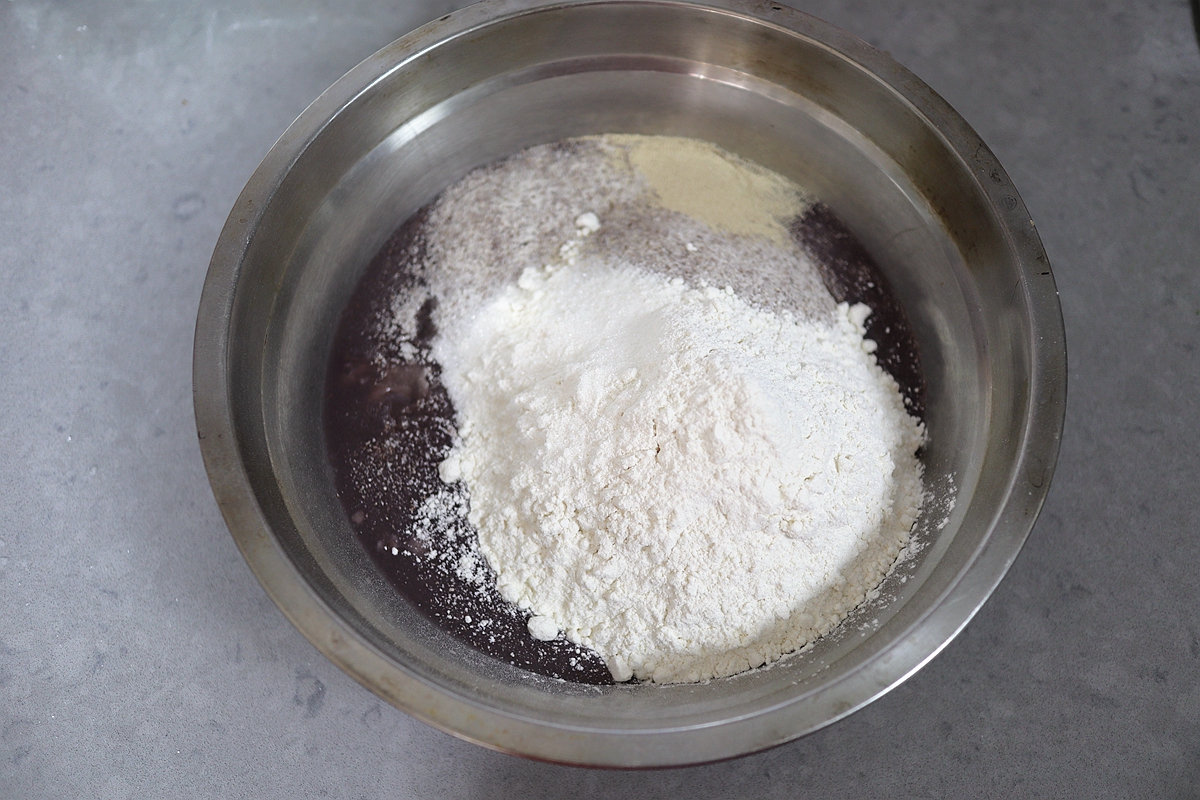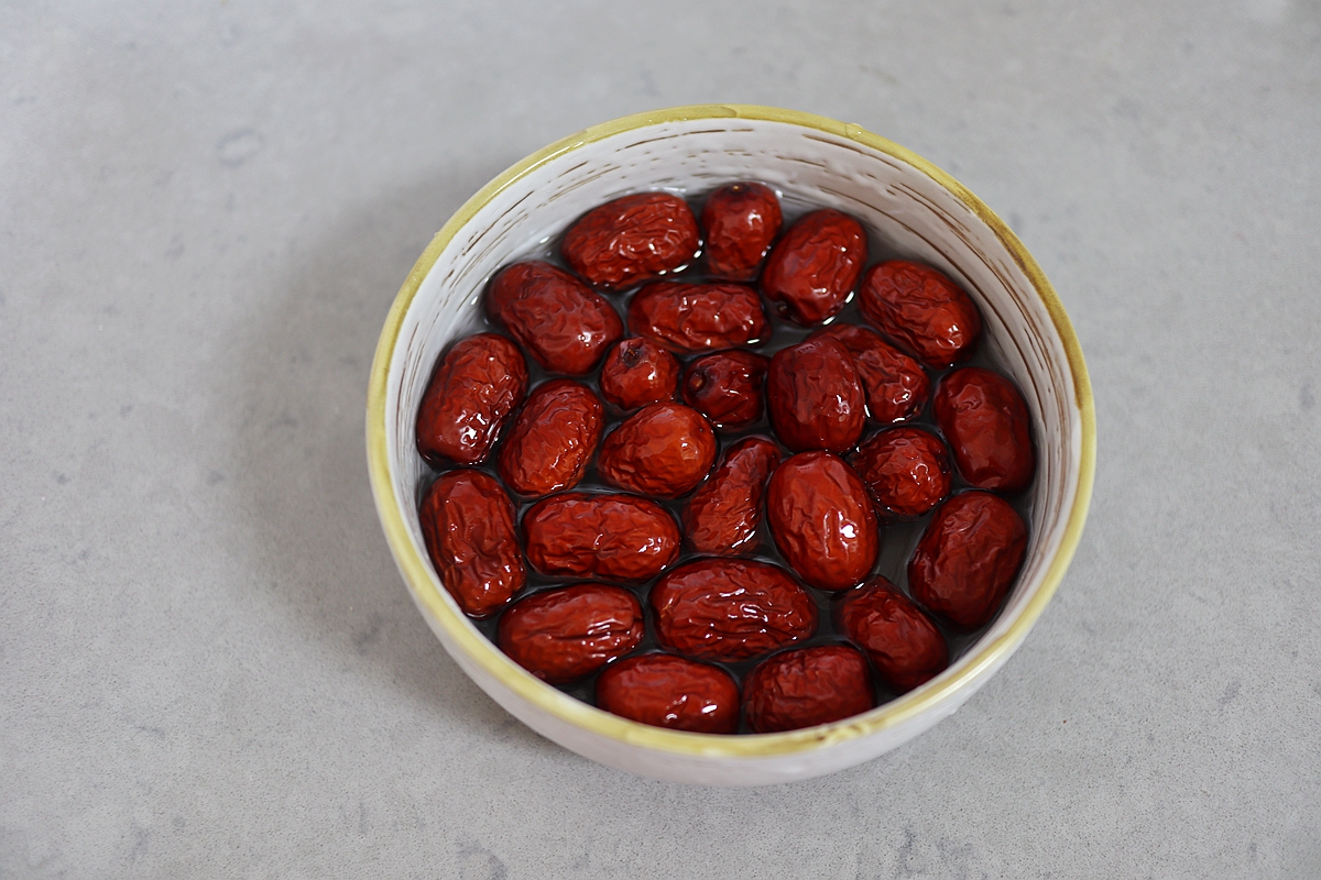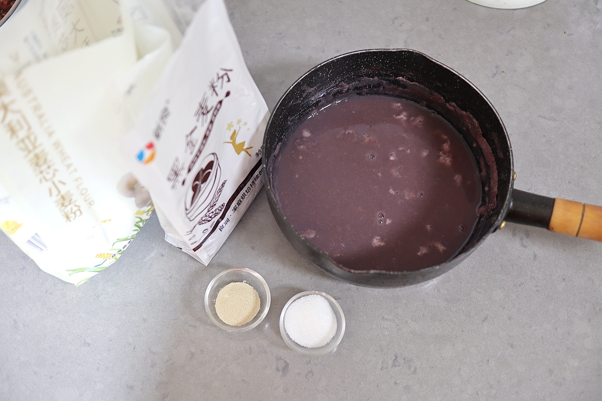 【材料】燕麦紫米豆浆340克,黑全麦粉250克,小麦面粉250克,白糖15克,干酵母5克,小红枣1碗