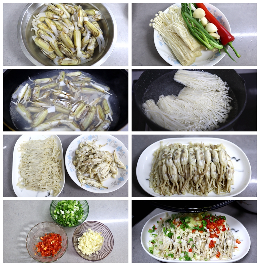 【材料】蛏子500克,金针菇300克,红甜椒半根,大蒜5瓣,香葱2棵,蒸鱼豉油40克,植物油15克