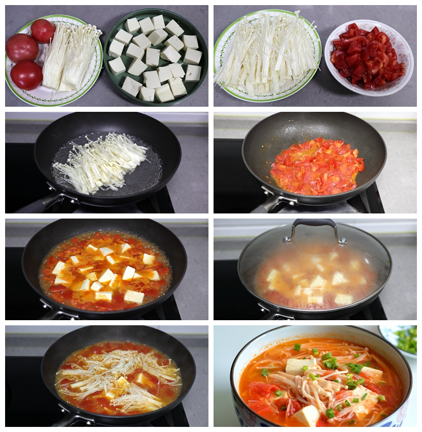 【材料】西红柿3个,金针菇1把,豆腐1块,油少许,盐适量,水适量,香葱少许