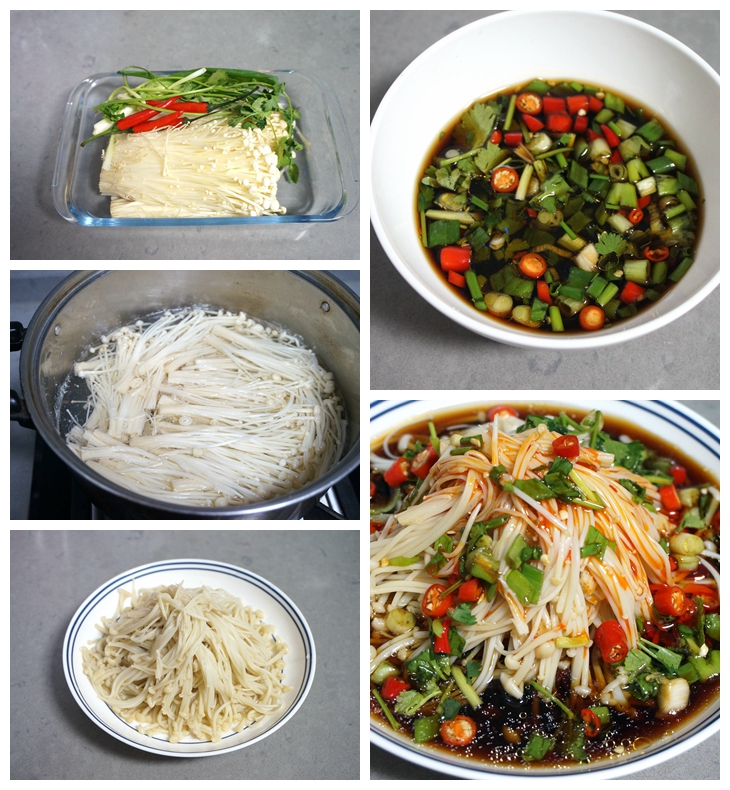 【材料】金针菇1把,小米辣4个,香葱2棵,香菜1棵,生抽适量、米醋适量,香油少许,辣椒油适量
