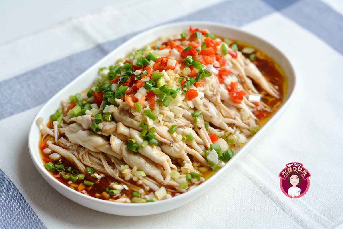 很爽口的一道开胃小菜,金针菇焯水后,只调个碗汁拌一拌,撒上香葱、小米辣,香嫩脆挺开胃,适合春天吃,老少皆宜。