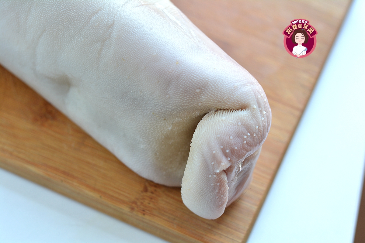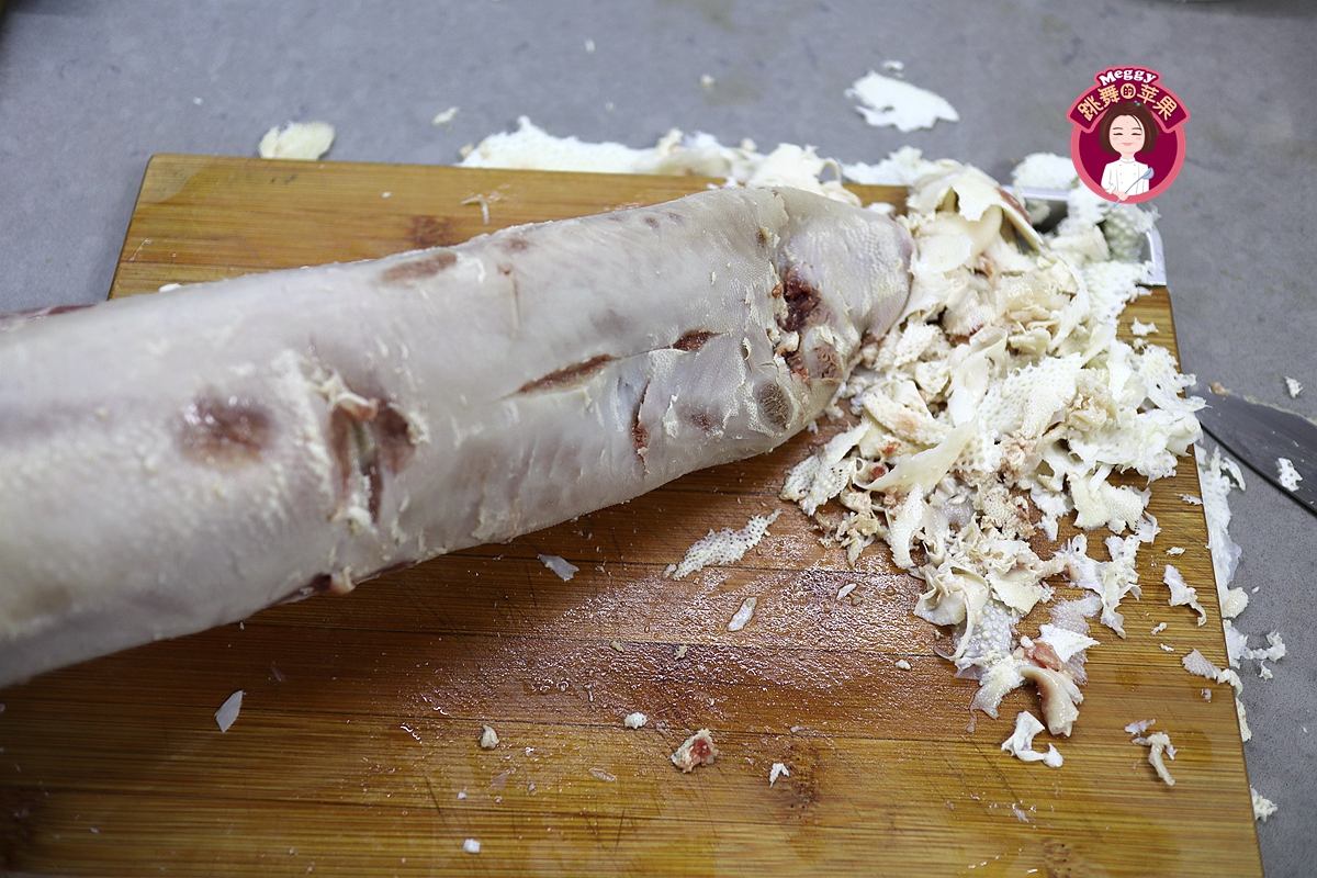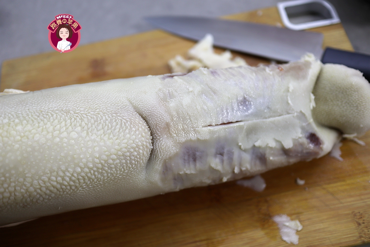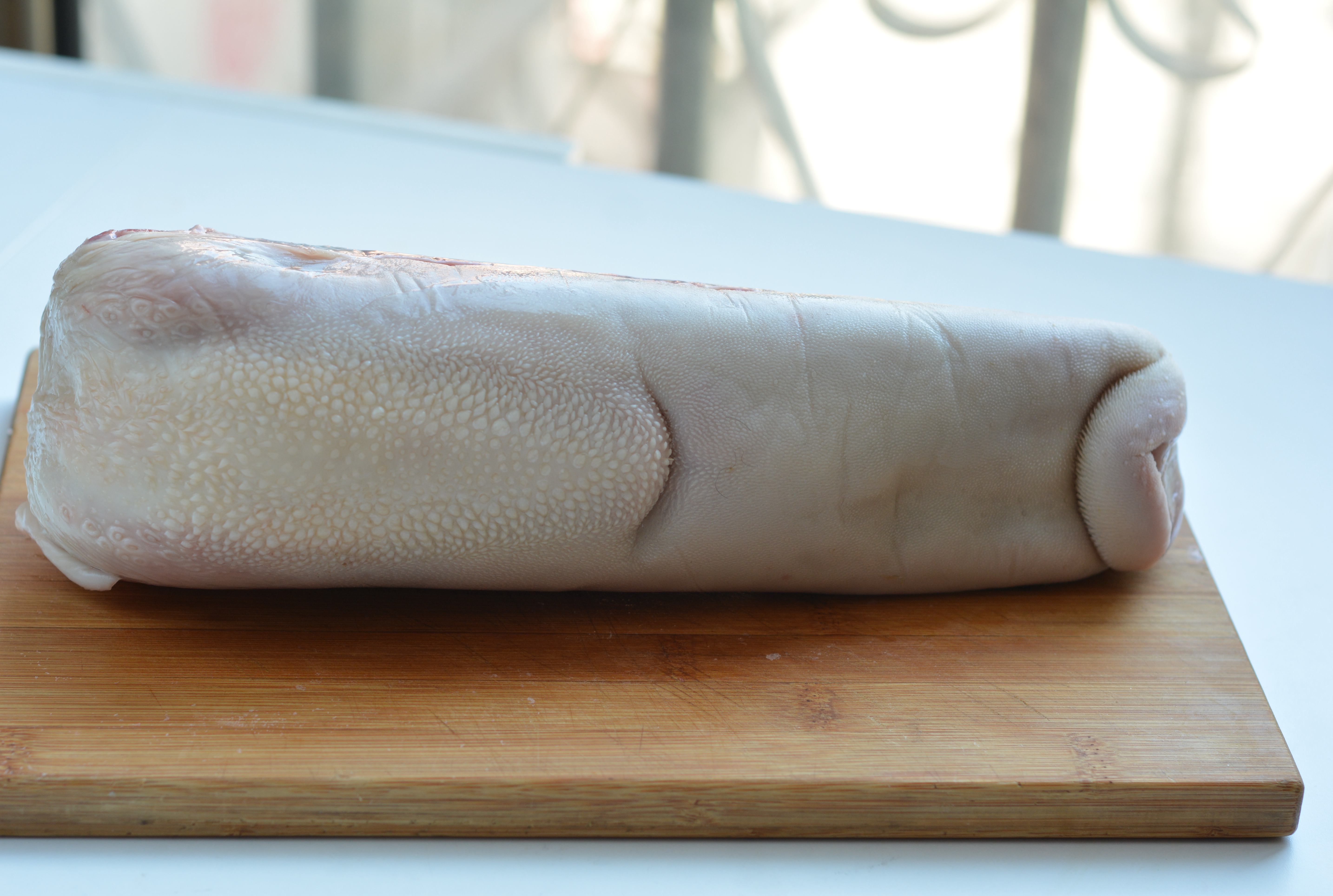 我先用刀尖把舌头中间划了一刀,看看表皮的深浅,然后用刀把那层带豆豆的给片了几下。有说把舌头完全冷冻后用削皮刀刮,这方法我试了,不可行,最后改成用菜刀了,但还是弄得稀里哗啦挺难看。