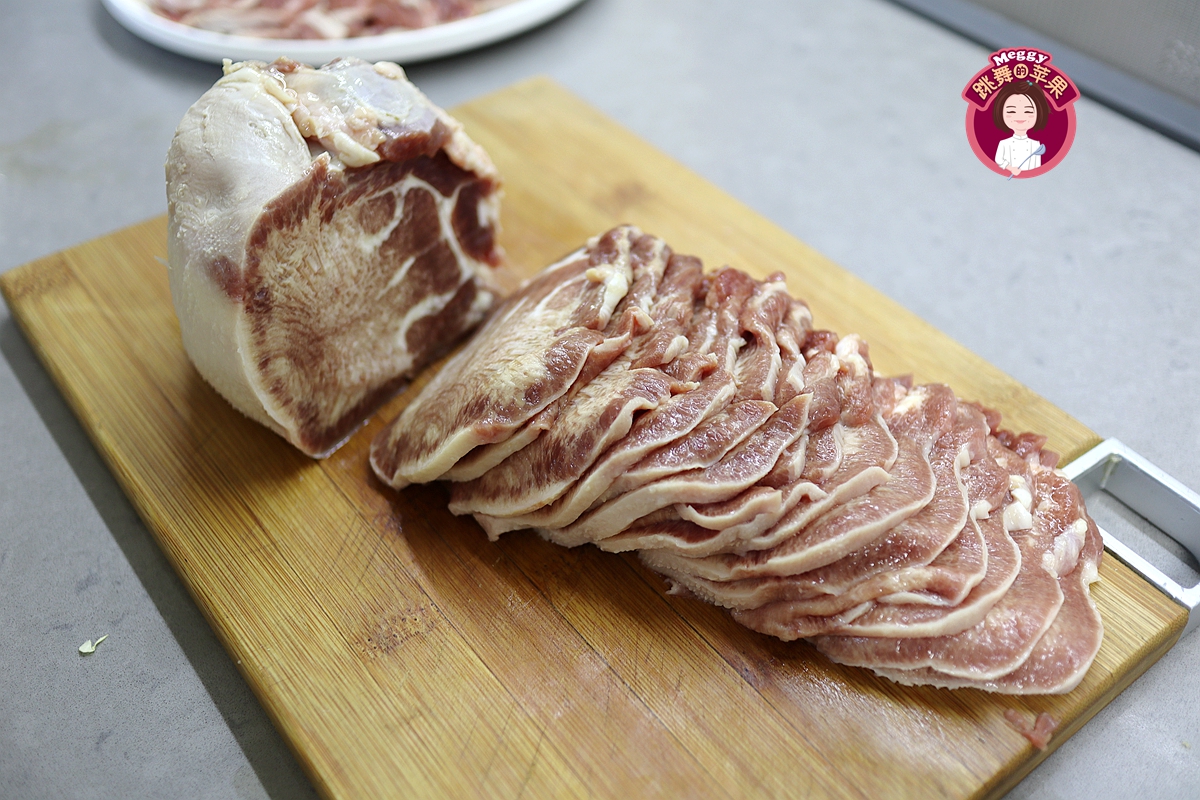 去了表皮的牛舌切薄片,越薄越好,但是因为外层被热水烫过了,所以外软内硬,还是不好下刀子。