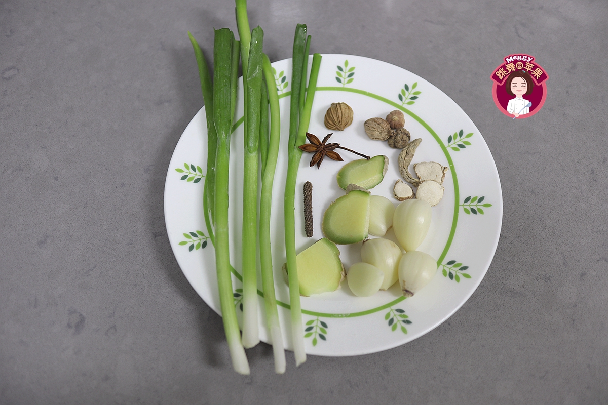 调料也准备好:4棵小葱、姜片、大蒜、1颗八角、几颗草果、几片白芷,还有几颗我也叫不上名字的香料。常规的盐和酱油就不出镜了。