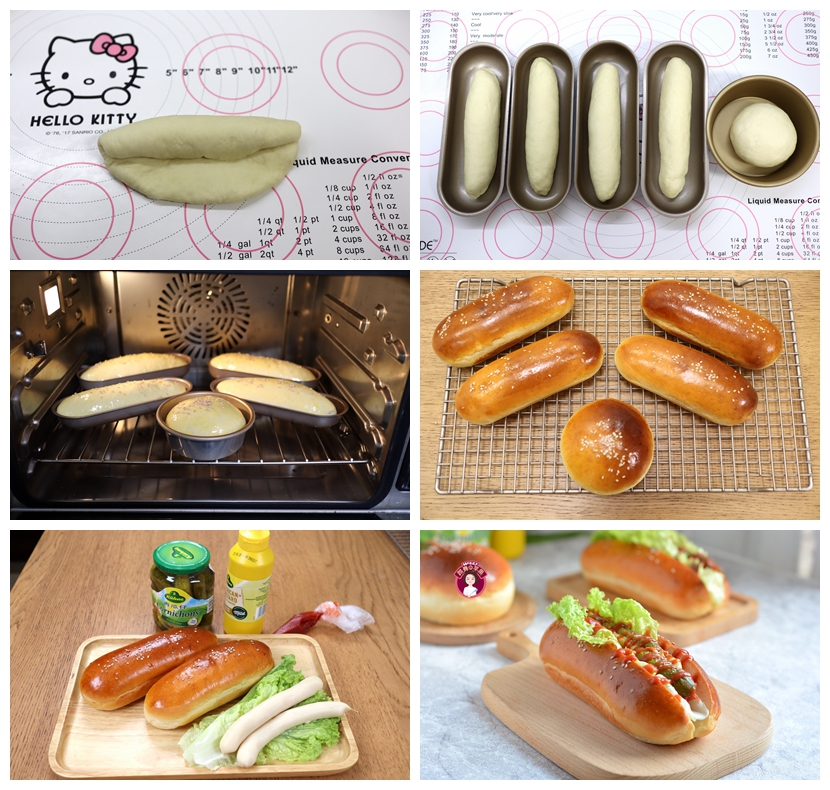 9. 封口捏严,压在下面,光滑面朝上,码放在热狗模具中,我只有4个热狗模具,多出来的一个就搓圆放在汉堡包的模具中;放发酵箱二次发酵,温度38,湿度80,时间20-30分钟;