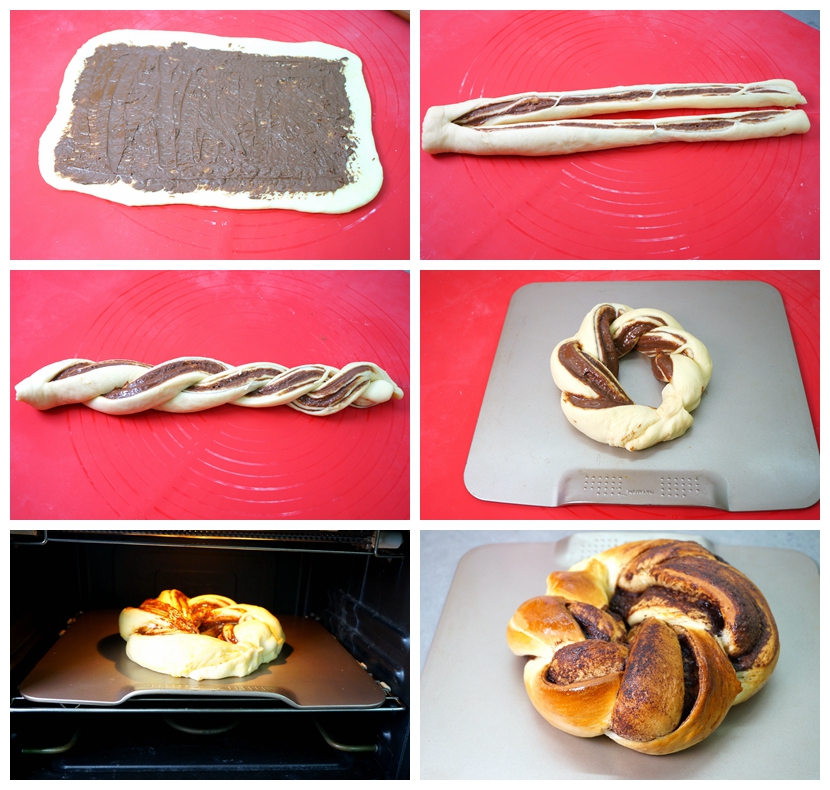 10. 两端一对合,成花环状,然后转移到不粘烤盘上,送入烤箱中进行二次发酵。烤箱的密封性能好,所以无需用发酵档,直接关上门自然发酵就可以了;