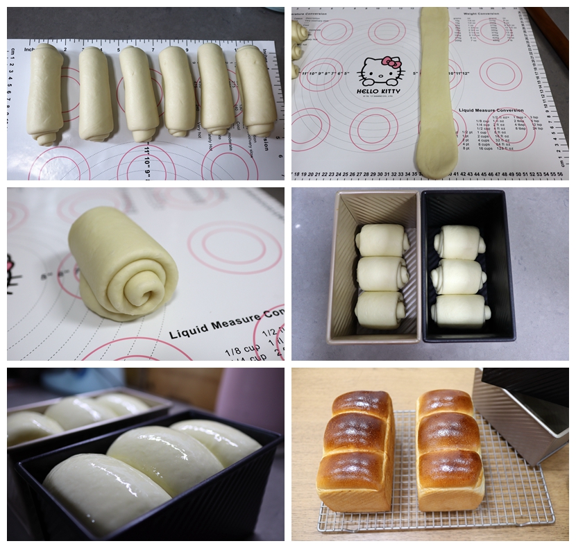 9. 从上向下卷成卷,一共卷了3.5圈;这是一次发酵吐司想拉丝和弥补面团状态不足的方法,面片擀得越长,拉丝的效果越好;