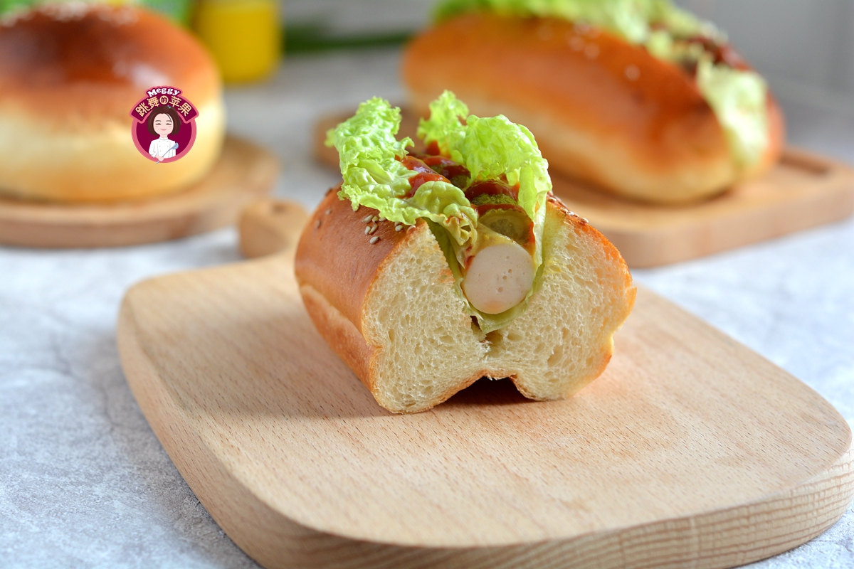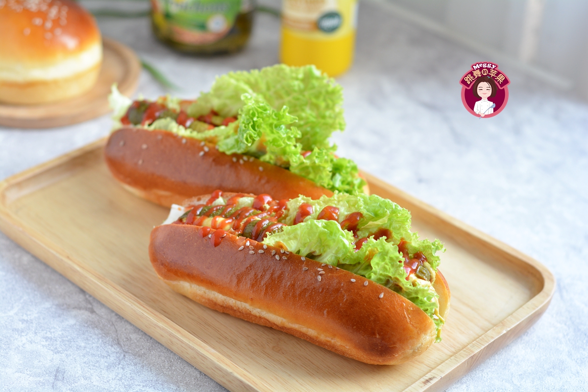 12. 按自己的喜欢口味放食材,做成热狗即可。我用的鸡肉肠、生菜、番茄酱、冠利青瓜仔和美式芥末酱。