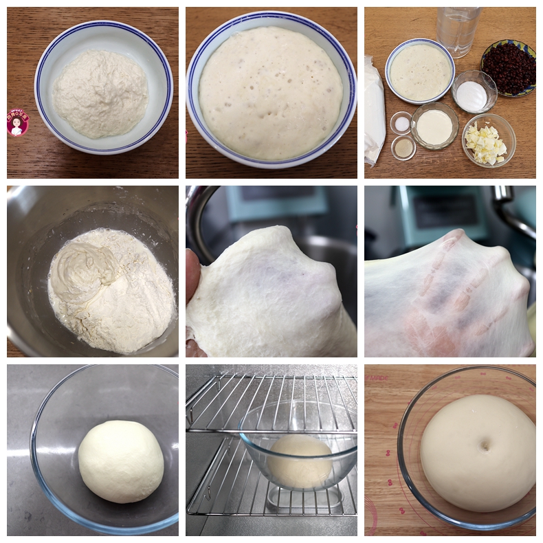 3. 波兰种和主面团材料准备好:高筋面粉320克,耐高糖干酵母4克,盐4克,白糖40克,淡奶油60克,凉水130克,黄油40克;淡奶油可以增加面包的柔软度和醇香口感,如果可以用等量的原味酸奶代替,或者用少于10-20克的鲜牛奶或者凉水代替;红豆是自制的,泡好后用高压锅压熟,保持完整的颗粒为宜,没有加白糖,原味的;煮红豆时加适量白糖,就是甜味红豆了;