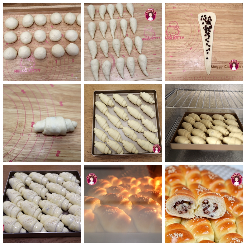 【夹馅装饰】煮熟的原味红豆180克左右,表面刷蛋液适量,表面撒白芝麻适量