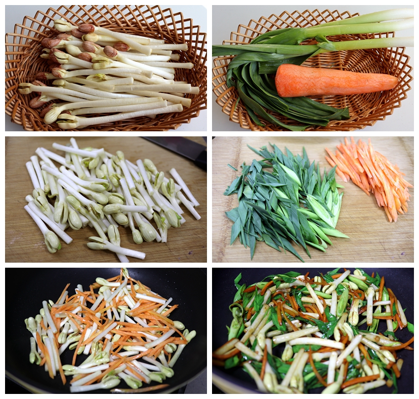 4. 青蒜斜切成段,胡萝卜切细丝;