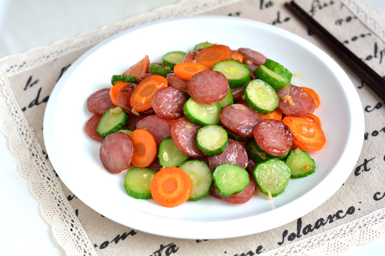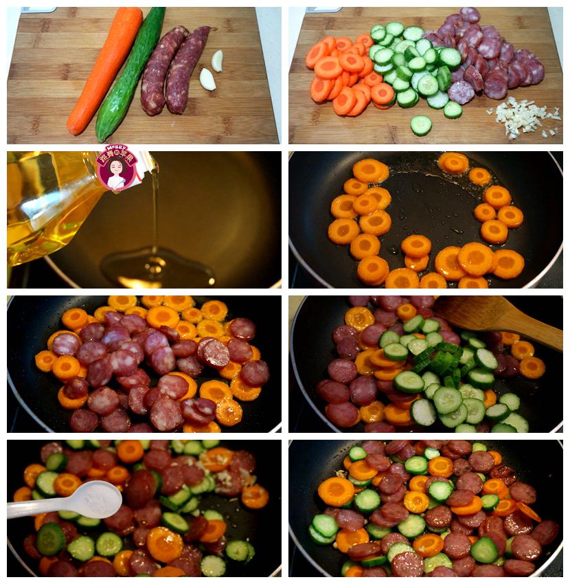 【材料】大香肠2根,小黄瓜1根,胡萝卜1根,盐,大蒜2瓣