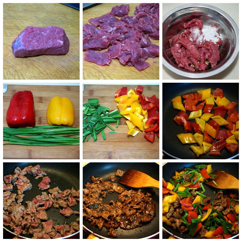 【材料】牛肉200克,红彩椒半个,黄彩椒半个,韭菜数根,植物油适量,盐少许,料酒少许,淀粉1小勺,酱油少许