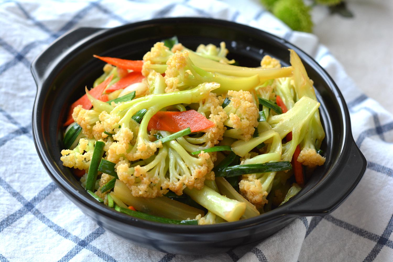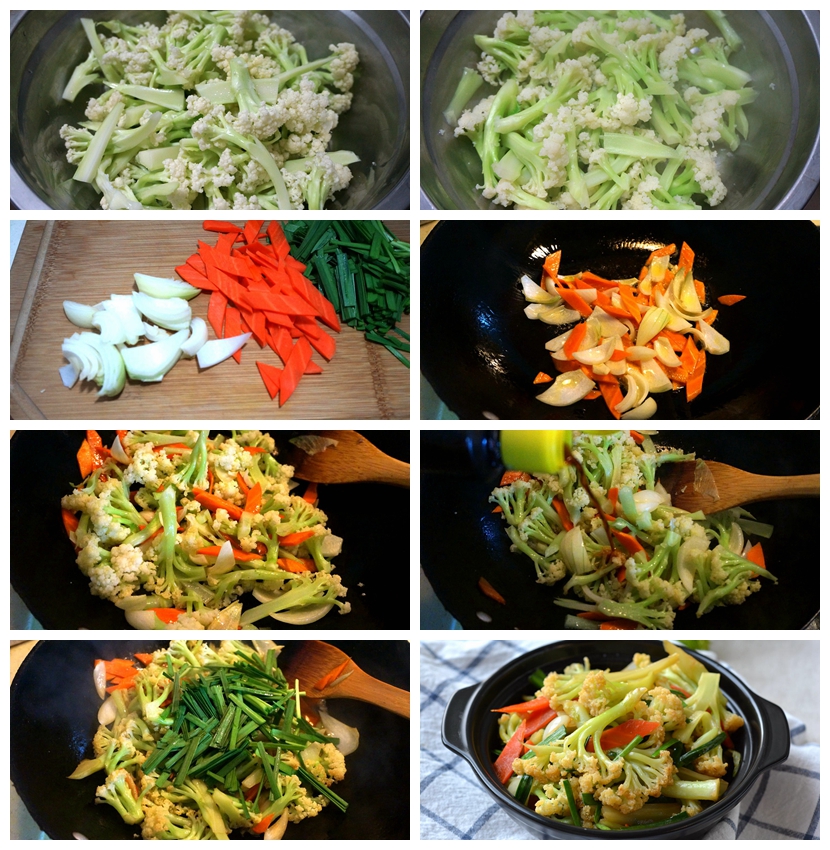 【材料】菜花适量,胡萝卜半根,洋葱半个,韭菜1把,油适量,生抽适量,盐少许,蚝油少许