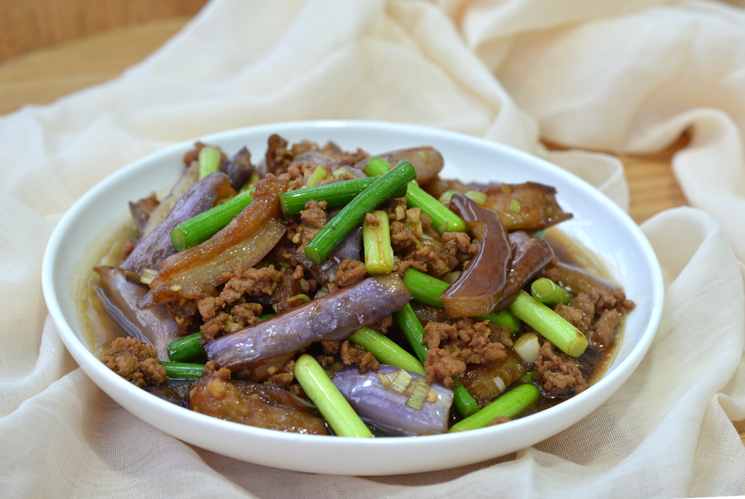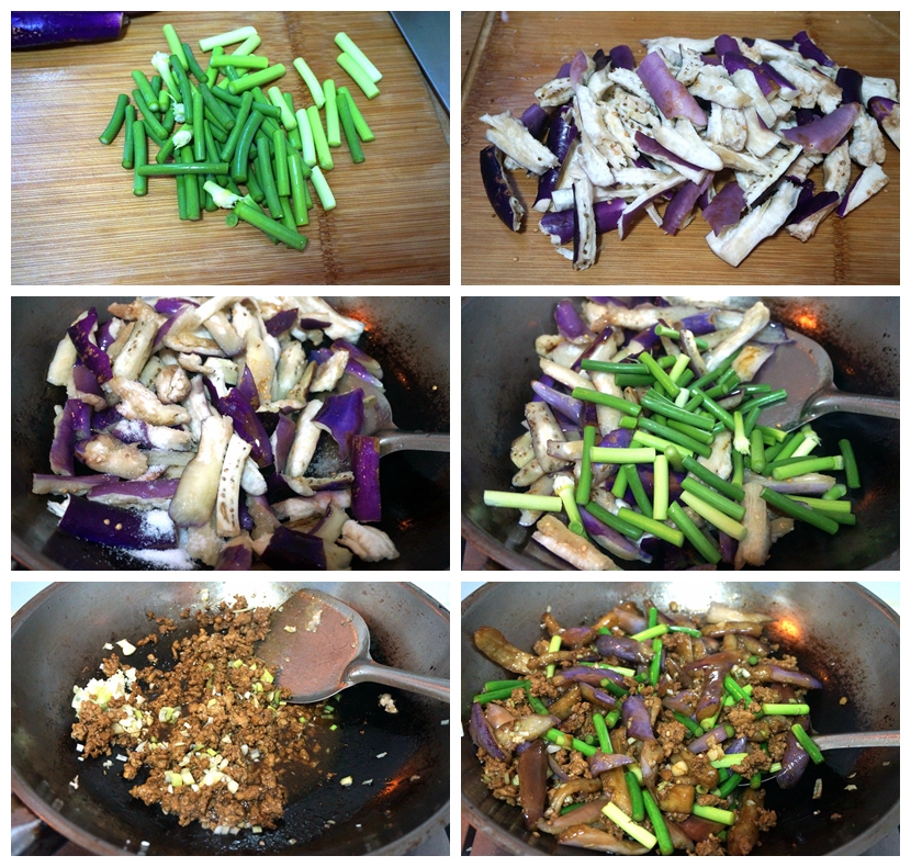 【材料】紫长茄子数根,肉馅适量,蒜薹数根,油少许,盐适量,酱油少许,大蒜4瓣,葱花少许