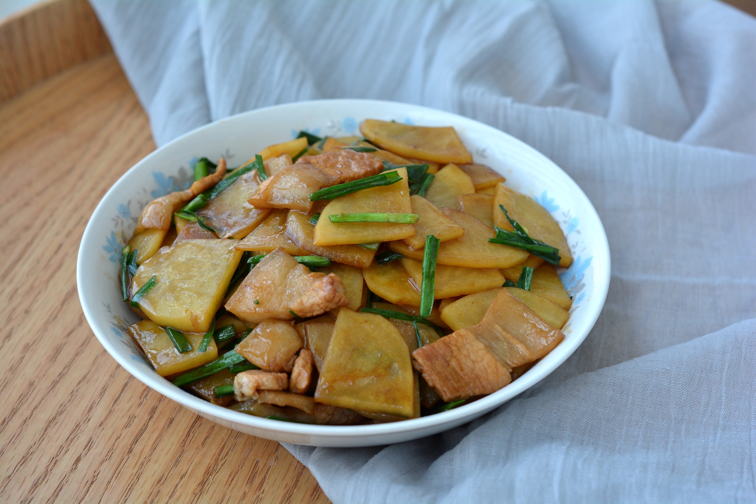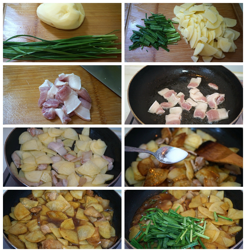 【材料】大土豆1个,韭菜1小把,带皮五花肉1块,油少许,酱油少许,盐适量,凉水少许