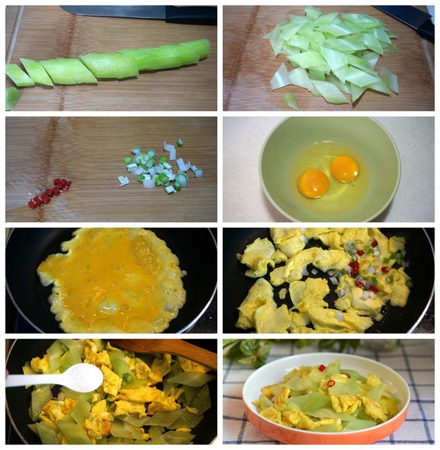 材料:鸡蛋两个,莴笋半根,小米椒一个,葱花,盐