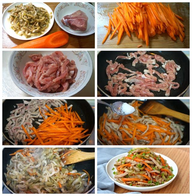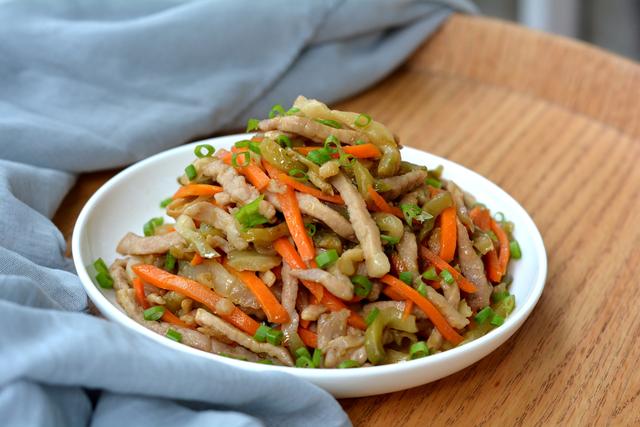 材料:榨菜丝1盘,猪瘦肉1块,胡萝卜半根,油适量,盐少许,香葱少许,淀粉1小勺