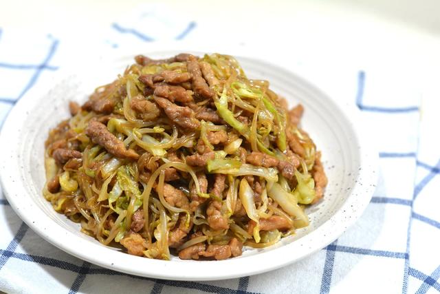 材料:牛里脊1块,豆芽1把,粉丝1把,圆白菜四分之一个,油适量,酱油适量,葱花少许,盐适量,淀粉1小勺