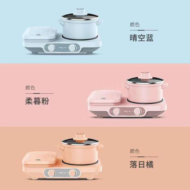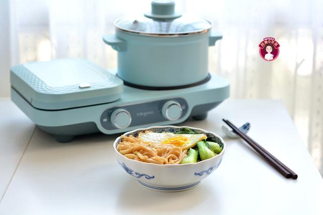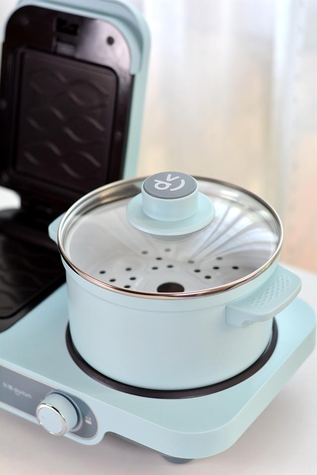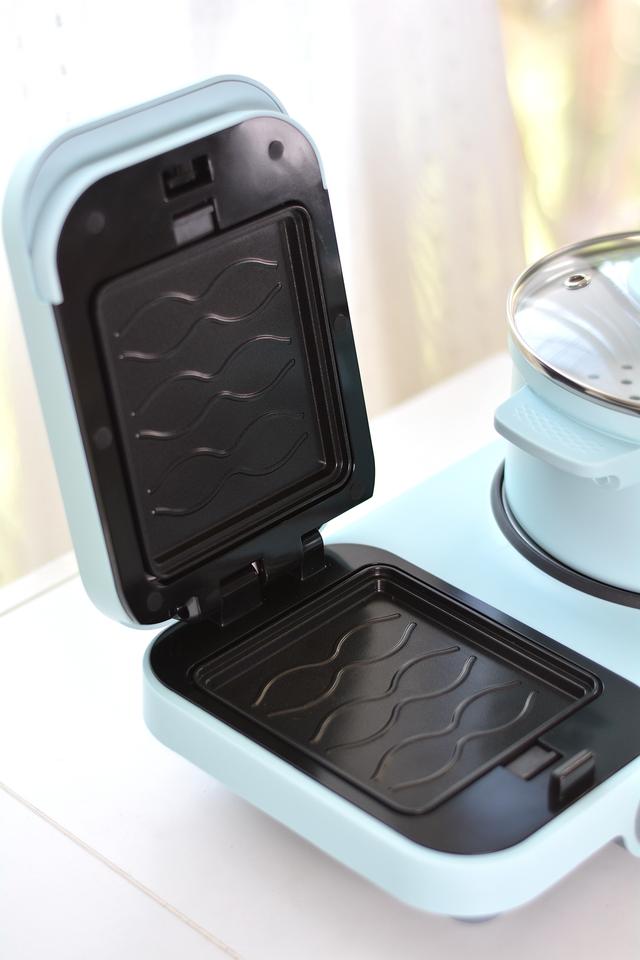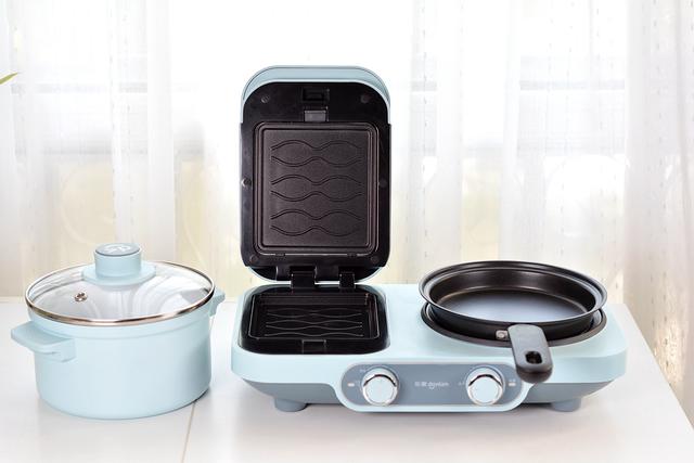 小机器,大功能。除了多用途的煮锅、蒸屉、煎炒锅外,旁边这个三明治机也是相当给力。短短几分钟就能将三明治“变”出来,想吃啥样的就可劲儿地往里“招呼”吧!