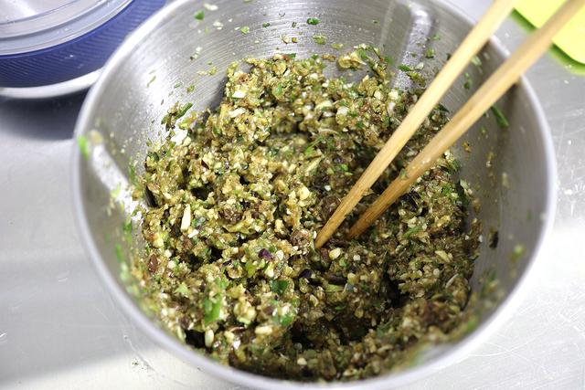 倒少许芝麻香油,用筷子将这些材料搅拌均匀即可;如果想要保留多一些的茄子汁,可以提前用温水泡一把粉丝,把粉丝切碎放在馅中同拌,这样就能将茄子汁吸收在粉丝中了;