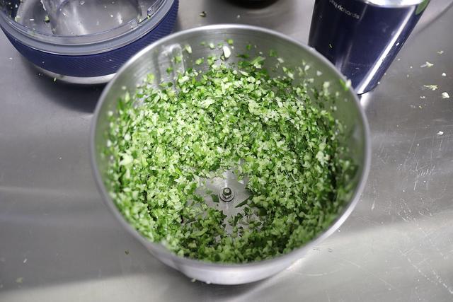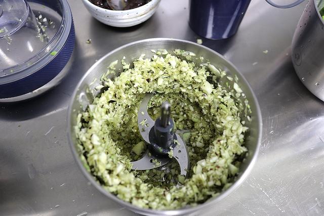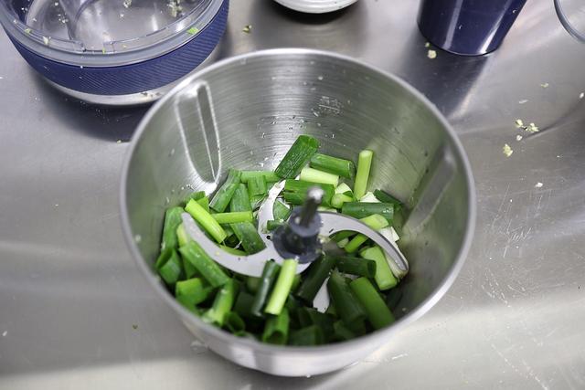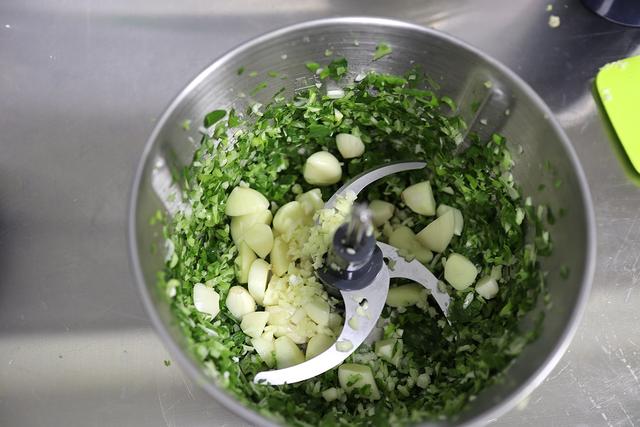 转动5秒打成葱末,想起来大蒜还没打,又顺手把大蒜扔进料理机中;