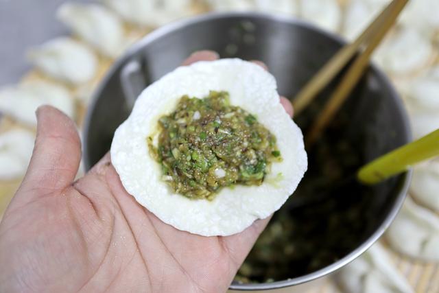 取适量馅放在圆皮上,馅多馅少看自己的手艺喽;