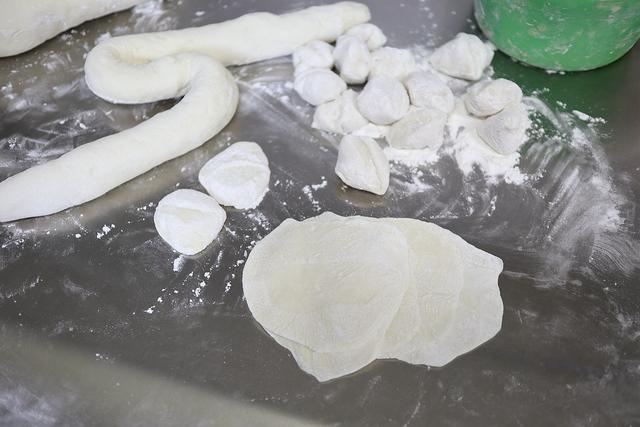 饧好的面团搓成长条,切成大小均匀的剂子,擀成中间稍厚、四周略薄的圆皮;