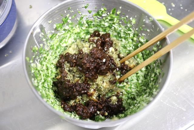 炸酱的做法我在文末的“私房话”里有简单的叙述,在我以前的文章中也有详细的图文制作。加了炸酱后,茄子馅立马变得与众不同,不但酱香浓郁,还使得馅料有点粘稠的感觉。