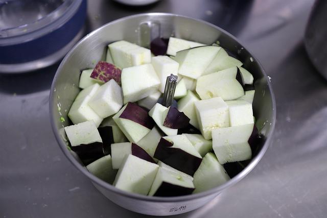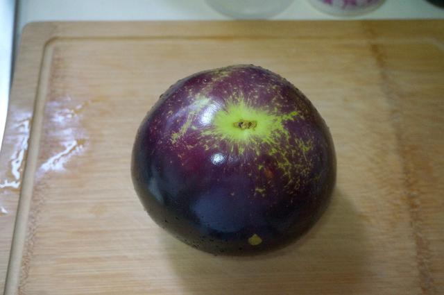 圆茄子洗净,去蒂,皮留着不削,里面富含矿物质及花青素;
