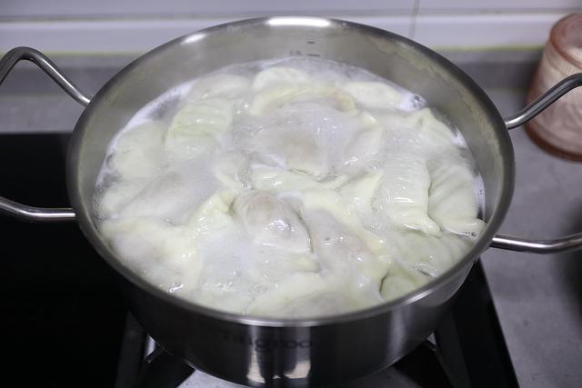 将适量饺子入锅中,用勺子沿着锅边推动,使水流带动饺子转动,防止沉底粘连;待饺子全部都胀鼓鼓的了,捞出食用。