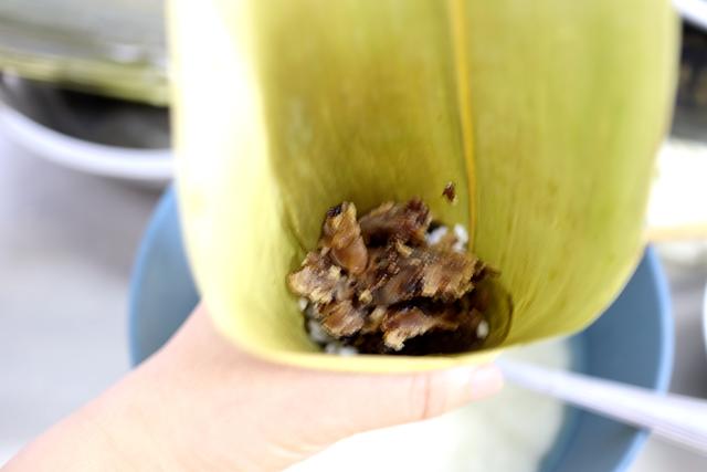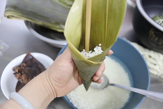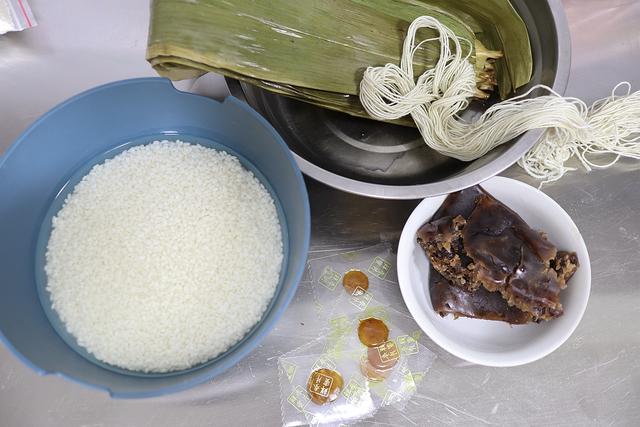 【材料】 圆粒糯米,玫瑰豆沙馅,鲜参蜜片,凉水,粽叶