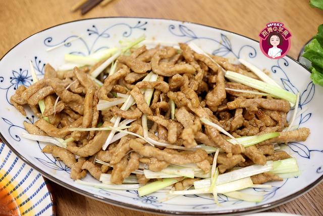 这是一道打破传统的家庭版京酱肉丝,甜面酱没放很多,只薄薄的裹了一层。临出锅前把葱丝倒在肉丝里,略一搅拌即可。