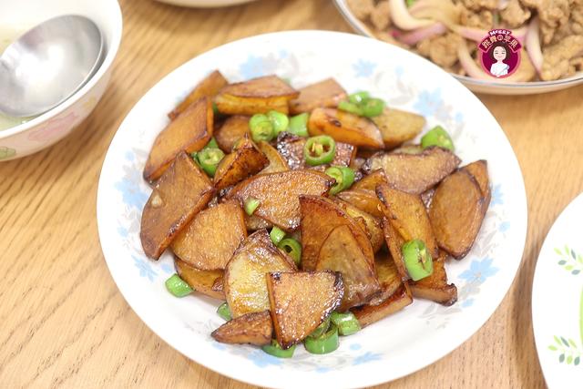 做法:黄心土豆切厚片,不要过水,炒锅中倒少许油,中小火将土豆片两面炒至微黄、有焦边;多余的淀粉附着在土豆片上形成较厚实的淀粉“嗄巴”,撒少许盐,点适量酱油,出锅前点缀青辣椒。是一道口感软糯而周边酥香入味的开胃小菜。青红辣椒可随口味放,还有装饰的效果。