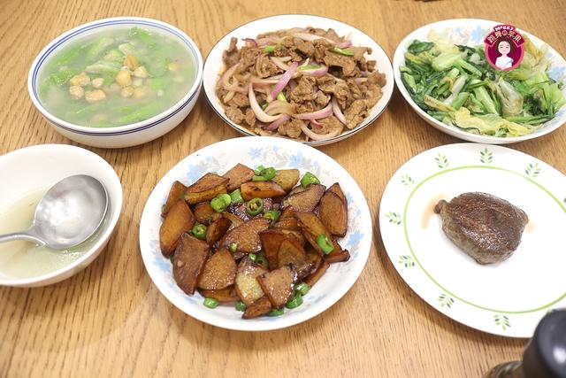 这顿晚餐加上那块牛排,满打满算勉强算4菜1汤,虽然很平常,但从搭配上看还是不错的:红肉、海产品,叶菜、瓜果菜、根茎菜一应俱全,主食是米饭,7大营养素全乎了。