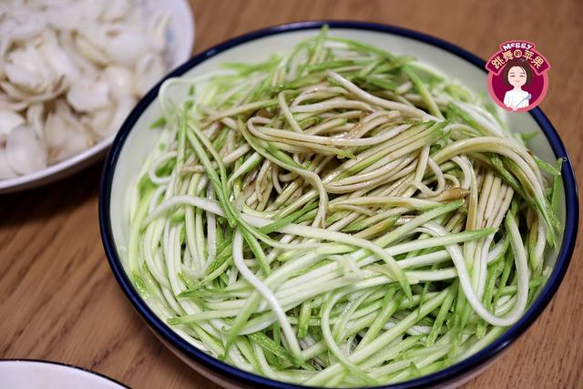 又是一道凉拌菜。西葫芦用擦丝器擦丝,无需焯水,直接装盘,开吃前将调好的芥汁倒在上面,抄底吃,又脆又嫩又有滋味。