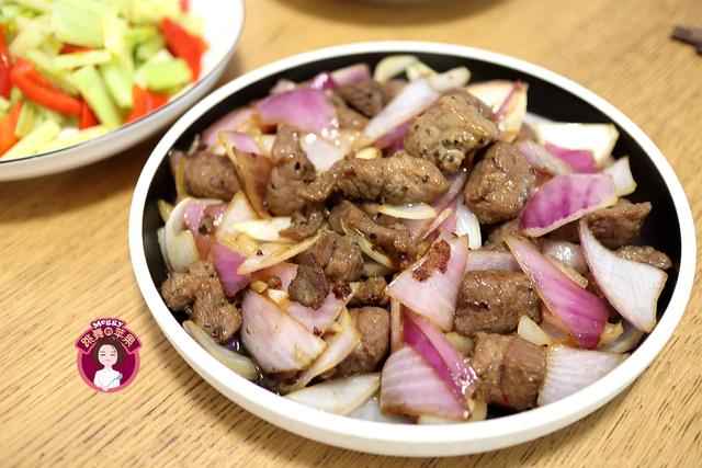用黑椒调理好的牛肉粒非常嫩,解冻之后就能入锅炒了。洋葱切块,待牛肉炒到完全变色时将洋葱块入锅翻炒;肉块略缩小,洋葱稍变软,即可出锅。