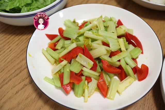 红椒只红不辣,口感清甜;芹菜脆嫩多汁富含粗纤维,二者入锅简单一炒,一红一绿,搭配着也好看。