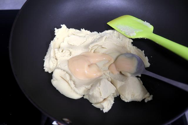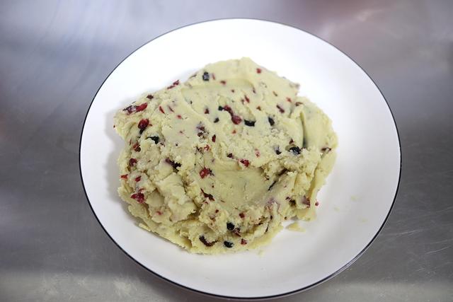 10.待豆沙晾到温热时,将切碎的蔓越莓干拌入豆沙中;