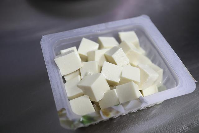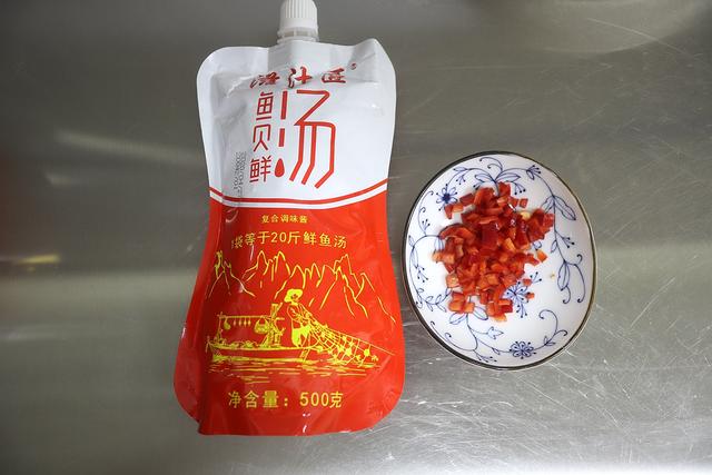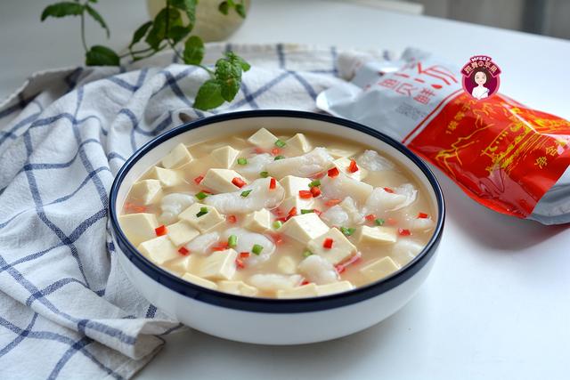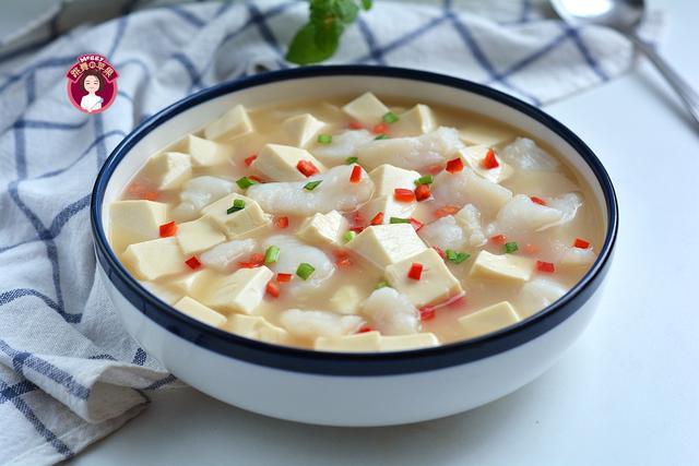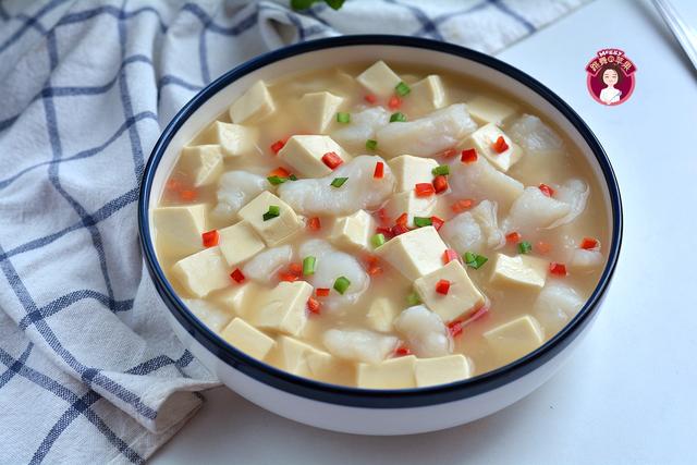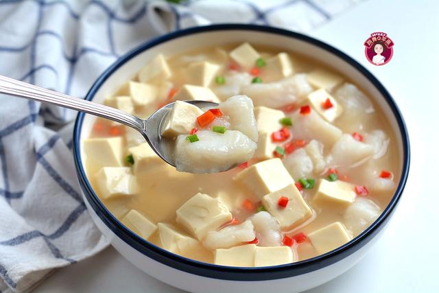 【材料】 嫩豆腐1块,巴沙鱼柳1条,鲜贝鱼汤30克,清水1锅,淀粉少许,红椒丁少许