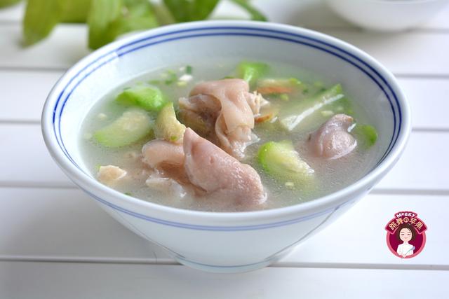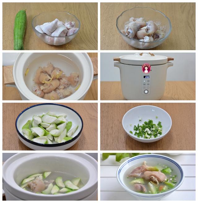 猪蹄富含胶原蛋白,口感就软糯糯让人喜欢;丝瓜又称水瓜,味道微甜,外绿内白,有清热祛火利尿的功效。这二者结合在一起,清清爽爽,喝两碗也不上火,还能起到补水开胃的好处。