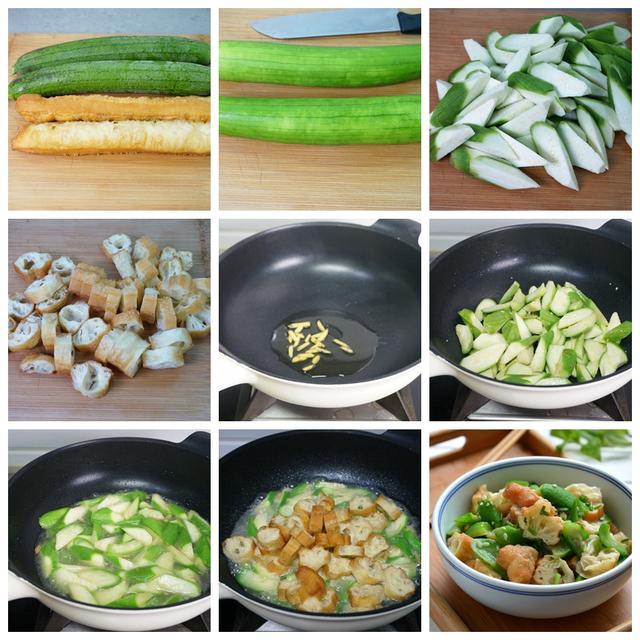 【材料】丝瓜2根,油条2根,油少许,姜少许,盐适量,蚝油少许,香葱少许