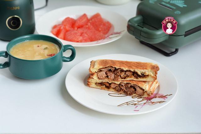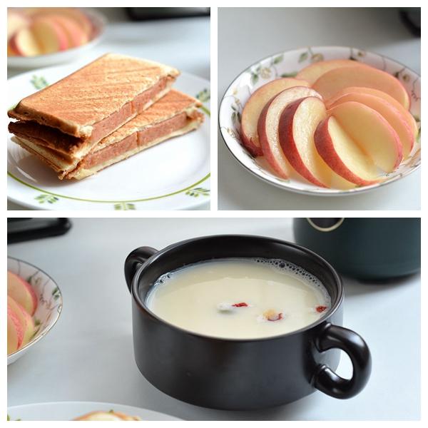 米糊中的杂粮不限于这几种,可以随意搭配,但用量要以豆浆机的建议用量为准;米糊全程需要20分钟,三明治可在米糊快完成时制作,这样可同步吃上热乎的吐司和米糊。