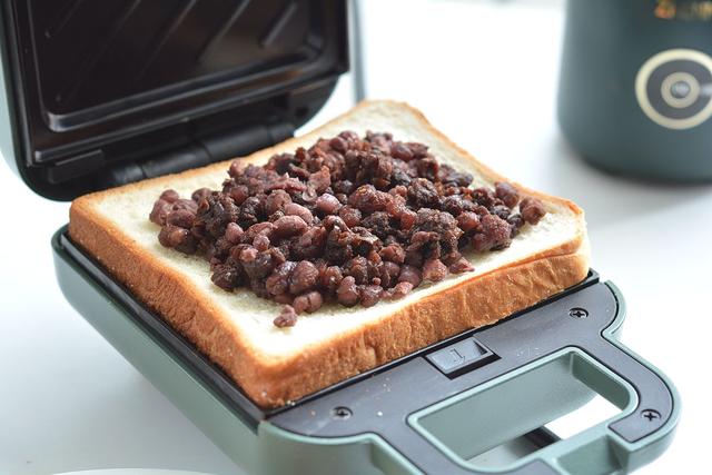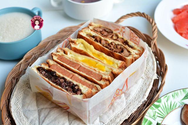 材料:吐司8片,午餐肉2片,鸡蛋1个,奶酪2片,红烧排骨4块,蜜红豆适量