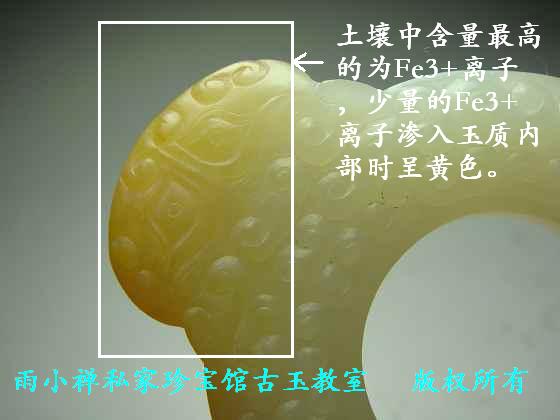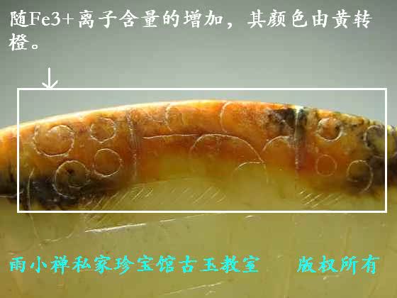 Fe3+呈红色,Fe2+呈青绿色,Cu2+为蓝色等等。其中土壤中含量最高的为Fe3+离子,少量的Fe3+离子渗入玉质内部时呈黄色(见图2-2-1标本春秋卷云纹虎头环),随Fe3+离子含量的增加,其颜色由黄转橙(见图2-2-2