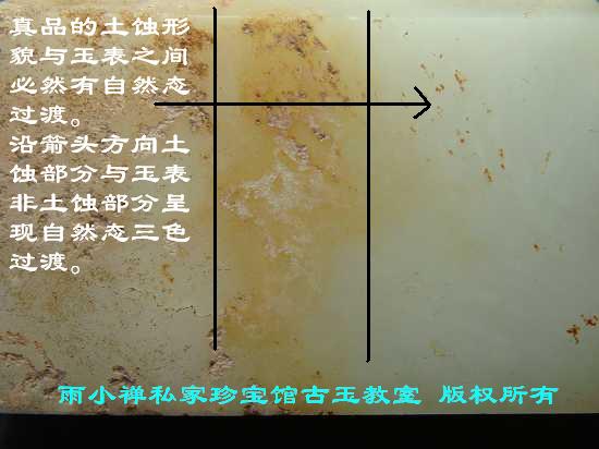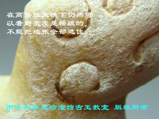 土蚀仿品的鉴别:在出土古玉身上出现的诸多特征中,以土蚀形貌最难仿造得逼真,它又是最常见的特征。所以不论是藏家还是古玩商,都把土蚀形貌看做辨识真假古玉的识别标志。不少人只要一看到玉器上存在土蚀现象,立即断定它是出土古玉真品,其他一切检查全部忘到脑后,掏钱就买。虽说上述种种形貌用人工无法仿造得逼真,但是造化之功却威力无穷,不论是土蚀斑还是蛀孔之类土蚀形貌,在玉材的天然表面上都能找到。这就给作伪高手提供了条件。他们可以巧妙地保留住具有上述特征的天然表面,精心设计,将其碾琢成器。再将全器做旧,让您看不出来。这类赝品虽不多见,由于了解它的人不多,很多古玉爱好者都上过当。这类赝品大多藏在柜台下,不展示出来,只有当古玩商确认您十分自信可眼力不佳时,他才看准时机,悄悄塞给您。由于缺乏思想准备,心中又一直想要搜寻高古的玉器,正好见到这件玉器表面存在非常明显的土蚀形貌,不由您不上当。所以,即使非常可靠、无法伪造的特征,也不能只根据一个特征就下结论,确认其为真品。其实您只要按操作步骤一步步仔细检查,即使精心仿制的赝品也难以蒙混过关,何况是这种天生子。这类赝品上最惹人注目的是那一块有土蚀形貌的表面,其形貌的确十分古老。如果再看看它的四周,玉色虽被做旧,与这块表面相比,仍然十分新鲜。实际上无论用什么方法都不能使玉器的其他部位的表面出现陈旧的包浆和挺括的亮光。为了赶工,通常都用金相砂纸将其打磨得油光光的,这恰好是赝品的有力证据。如果找块湿布把这块古老的玉皮四周好好擦擦,很快就露出原形了。原来土蚀形貌边上还带有玉皮,擦干净后残留的玉皮与周围的玉料之间有一圈清晰的界线。这时任何人都可以看出来,它原来是一件天生子!(注:真品的土蚀形貌与玉表之间必然有自然态过渡,凡是有清晰界限的一律给予否定!)如图1-2-4。