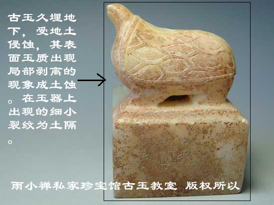 古玉久埋地下,受地土侵蚀,其表面玉质出现局部剥离的现象成土蚀。视土蚀形貌与受蚀程度的差异而有不同的名称。表面轻浅的一层玉质剥离称土蚀斑;更轻微的为土蚀痕,遍布周身的细小剥蚀浅坑,密集而不深,成为砂土坑,在玉器上出现的细小裂纹为土隔。以上种种统称土蚀,或称土蚀现象。如图1-2-1。