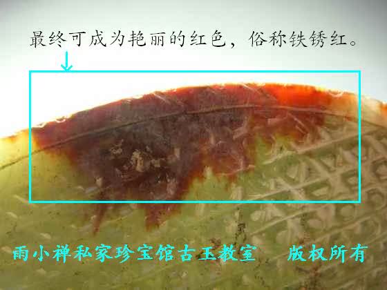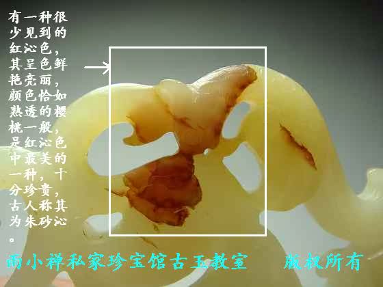 朱砂沁通常只在较小的区域内出现,不曾见到大片(或大范围)的朱砂沁存在,对其显色原因尚不清楚。有机质形成的红色不可能如此娇艳,三价铁离子同样不会如此美妙。姑且按古人的称呼,称其为朱砂沁。