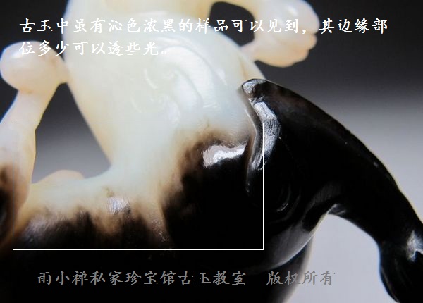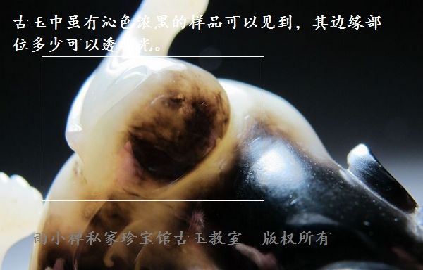 标本汉代黑漆古玉辟邪)。古玉中虽有沁色浓黑的样品可以见到,其边缘部位多少可以透些光,真正一点光线不透者十分罕见(见图2-2-5AB