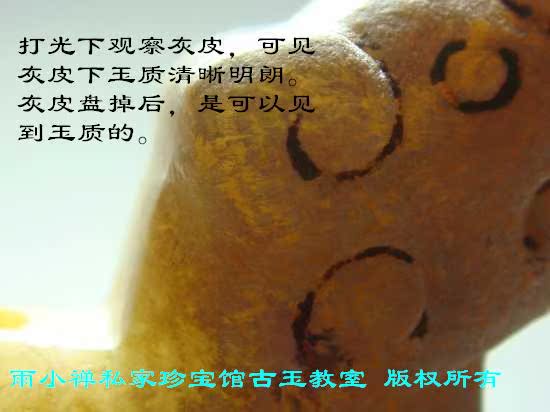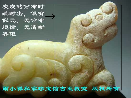 要判断一件玉器是否古玉真品,首选应该抓住玉器久埋地下以后必然会出现的最本质的变化,也就是说,这些变化必须是在玉器入土后才发生的。因此,玉材本身先天就存在的一切特征均不包括在内。出土古玉上发生的种种质变现象,计有灰皮、鸡骨白、土蚀斑、蛀孔、土隔、砂坑土、水沁、土气等。
